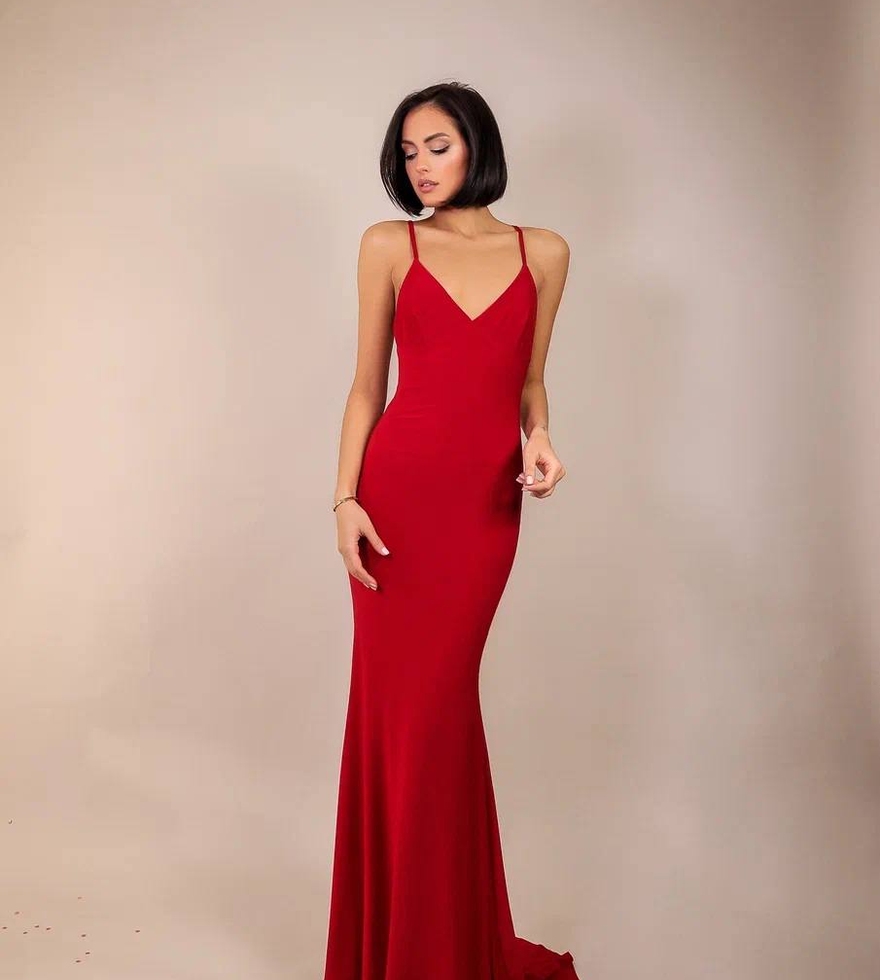 Платье в пол красного цвета со шлейфом, топ - майка на тонких бретелях с перекрестием, спина открытая